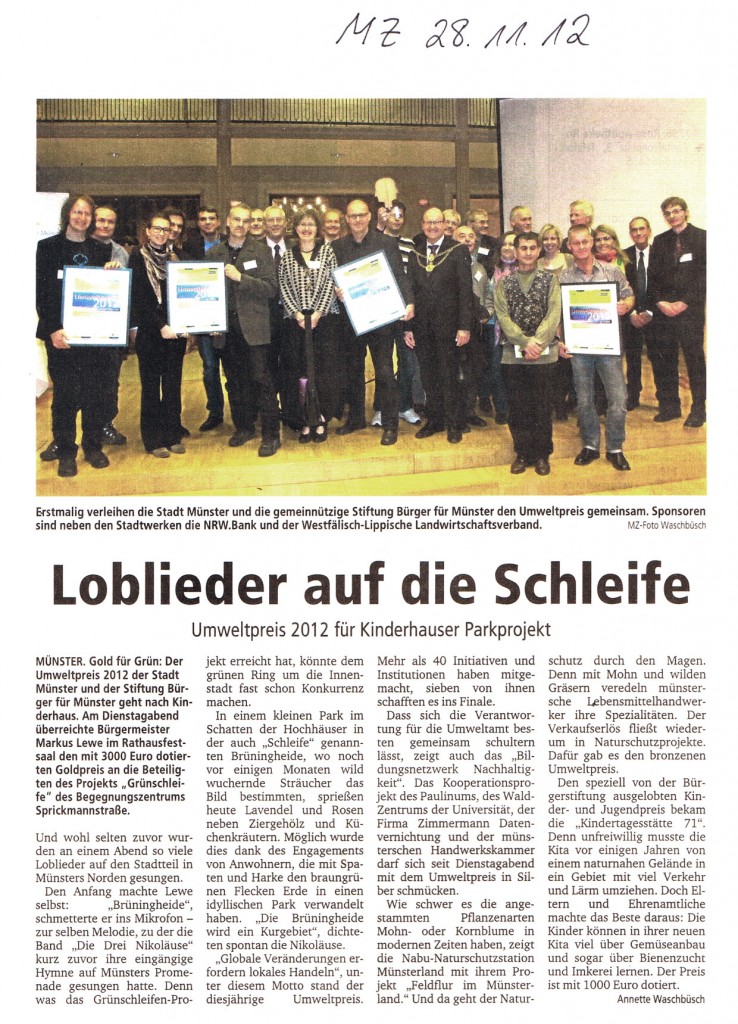 Unser Projekt „Grünschleife“ hat bereits im Jahr 2012 den Umweltpreis in Gold der Bürgerstiftung/Stadt Münster erhalten.